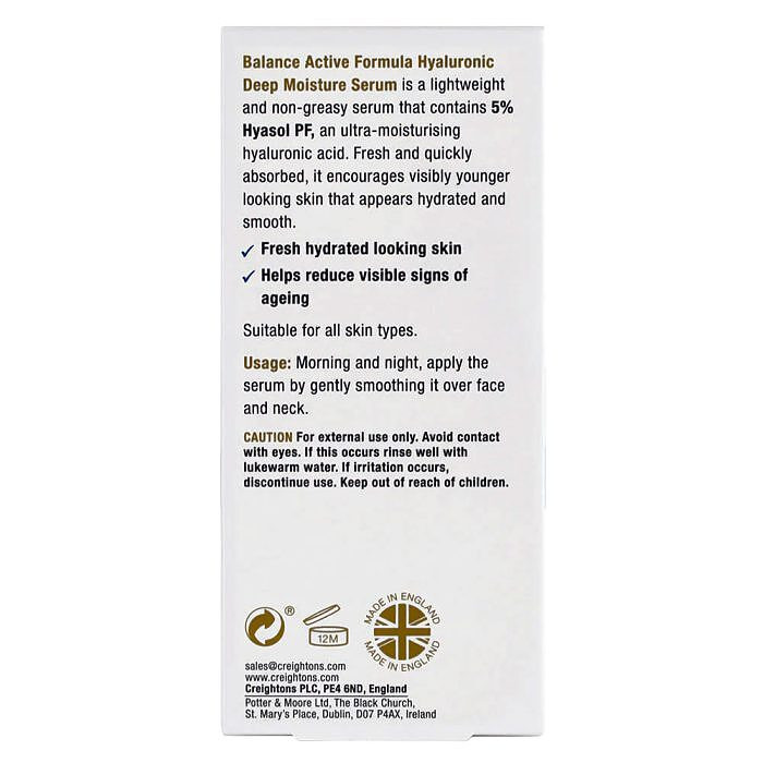 سرم آبرسان هیالورونیک دیپ مویسچر بالانس فرمولی سبک و بدون چربی دارد. این سرم غیر چرب، آبرسانی شدیدی را برای پوست فراهم می کند و خاصیت ارتجاعی آن را بهبود می بخشد. بعلاوه علائم قابل مشاهده پیری را کاهش داده و پوستی شاداب تر و مرطوب تر برایتان به ارمغان می آورد. به کمک این سرم پوستی با ظاهری تازه و هیدراته خواهید داشت. این محصول یک رطوبت پایدار و نجات دهنده را به ویژه برای پوست های کدر، کم آب و خشک ارائه می دهد. سرم آبرسان هیالورونیک بالانس بدون عطر و بو و بدون تست حیوانی می باشد.