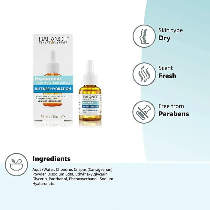 تامین رطوبت مورد نیاز پوست یکی از مهم ترین اقدامات برای مراقبت از آن است. سرم آبرسان و مرطوب کننده عمیق پوست حاوی هیالورونیک اسید برند Balance یک آبرسان قوی است که برای انواع پوست مناسب می باشد. این سرم از نظر متخصصین پوستی تست شده و به طور ماهرانه ای بدون پارابن، گلوتن یا رنگ فرموله شده است. لذا با پوست های حساس نیز سازگار است. این سرم با داشتن ترکیبات فعال قدرتمند به شما کمک می کند تا پوست سالم تر، شفاف تر و محکم تری داشته باشید.